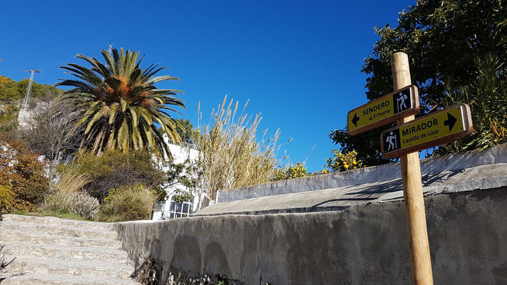 El principio de este sendero transcurre junto al antiguo molino de Lízar y a una acequia construida por los árabes para llevar agua desde la parte alta del río Higuerón para abastecer al pueblo y a los bancales.